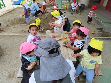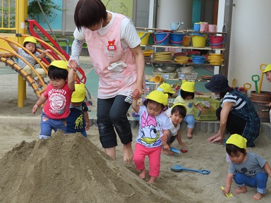6月になって、20度後半の気温が続き、みんな気持ちよく戸外で遊んでいます。今日は1歳児のたんぽぽさんが裸足で砂場へ。嫌がるお友達はなく、嬉しそうに砂の感触を楽しみながら、以上児さんのつくった大きなお山に登ったり、走り回っていました。