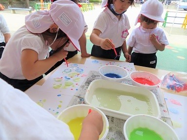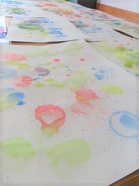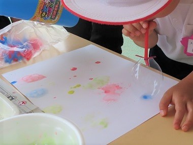 玄関ポーチではなでしこさんが、色とりどりのシャボン玉をしていました。紙の上にシャボン玉をつくると、いろんな色の水玉模様が!