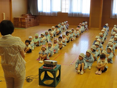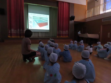 今日は以上児さんのプール開きがありました。以上児さんになると屋内プールに入れます。毎年「プール開き」は年長から年少までが遊戯室に集まり一緒に集会をするのですが、今年は学年毎集会を行い、園長先生のお話をお聞きし、スライドでプールへの入り方やお約束などを知りました。