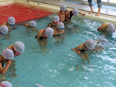 みんなで水の中を円を描くように走って水の流れを作り(洗濯機)、体の浮く面白さを感じていました。