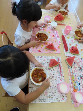 プール開きの給食は、具沢山のハヤシライスに今年初物のスイカでした!