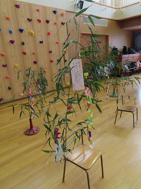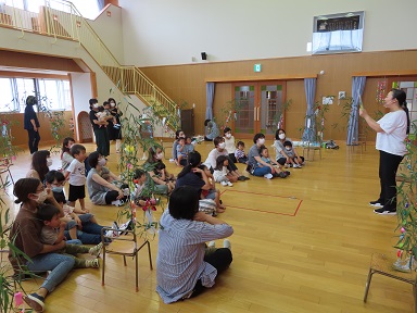 飾り付けた後には、素敵に飾った笹飾りを見ながら、みんなで『たなばた』を歌いましたよ。おかえりの会には『アンパンマン』の紙芝居も楽しみました。みんなやっぱりアンパンマン大好きですね!