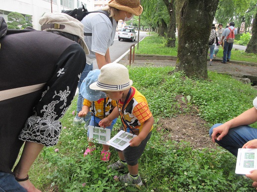 カードを持って、お母さん達と一緒に同じ草花を探してみたよ。見つけるたびにくらべっこ。