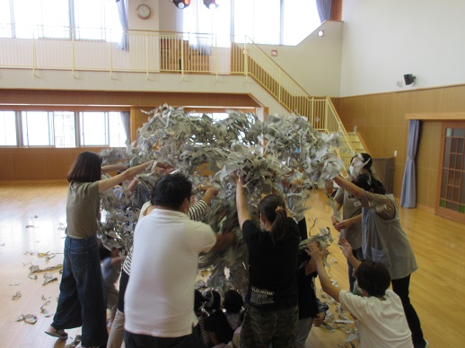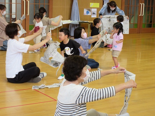 新聞紙で色々遊び、最後はいーっぱいちぎって、お母さんやお父さん達にかけてもらい大喜び!!