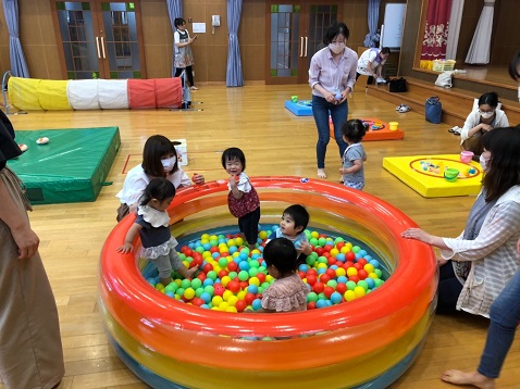 遊戯室に広がった楽しい場所で、お母さんや先生と一緒。