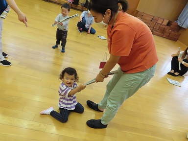 そして、ビリビリ破いてお母さんもストレス発散!雨に見立てて空中に飛ばしたり、最後には新聞紙を集めて丸め、ボールを作って遊ぶ等、広い遊戯室を駆け回りながら大喜びで遊びました。