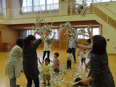 今回は砂場で遊ぶことになっていましたが、14日は雨が降っていて残念ながら外では遊べませんでしたが、遊戯室で新聞紙を使って遊びました。