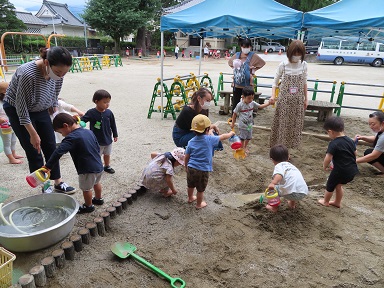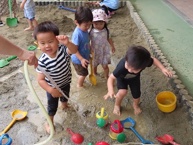 15日は何とかお天気が持ち、砂場で遊べました。汚れを気にせず水をジョロに汲んでは砂場に流し込み、川を作ったり、池を作ったりして遊びました。