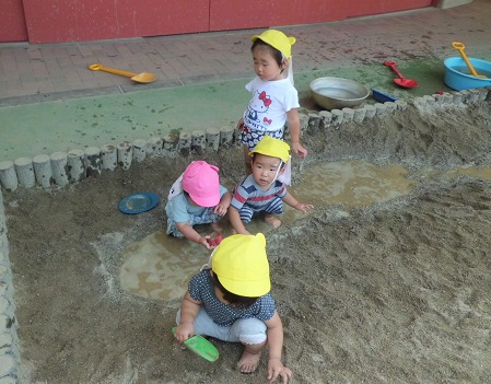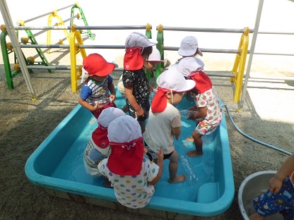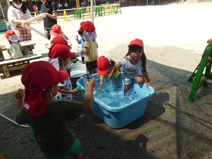 今日も暑さが厳しくなっています。2歳さんたちは溜めた水に入ったり浴びたり…