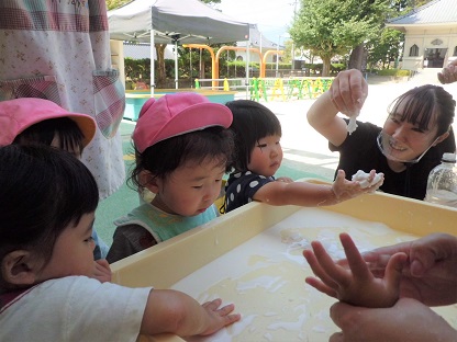 砂場でも水をいっぱい流してどろんこ遊び。片栗粉を溶いて不思議な感触を楽しんだり、ひんやりした気持ち良さを味わったり・・・
