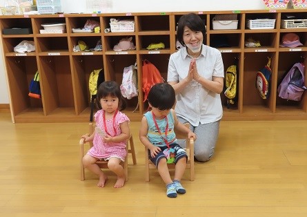 年長さんは積み木の特設ステージ(?)に立ち、ペンダントをかけてもらいました。