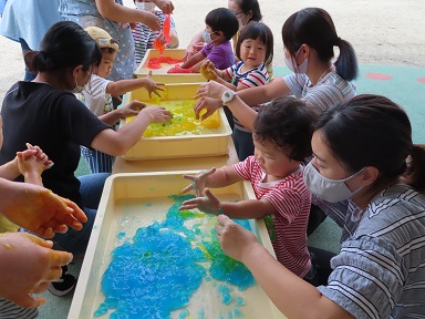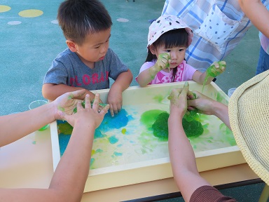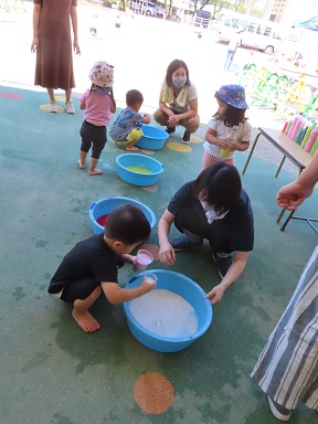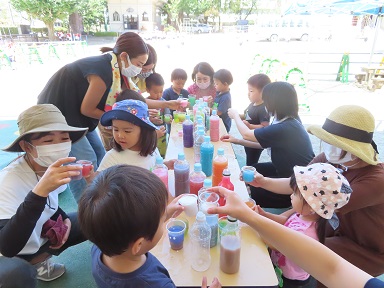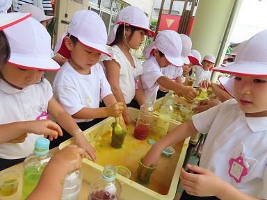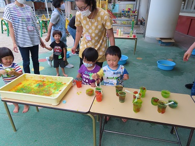スライムで遊んだ後は、赤・黄色・青・白の色水を使って、いろんな色のジュース作り!混色の不思議さを感じながら、繰り返し繰り返しペットボトルに色水を注ぎ込んでいました。最後には、沢山の種類のジュースができた事をお祝いして、かんぱ~い!ごっこ。よく分かっていて口に入れずにごっこができました。