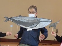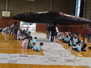 短大の先生がビニールで作ったクジラの尻尾を空気で膨らめて本物のようなリアルな尻尾を見せてくれました!子どもたちはこんなスケールの大きな体験は初めてで、大興奮でした。