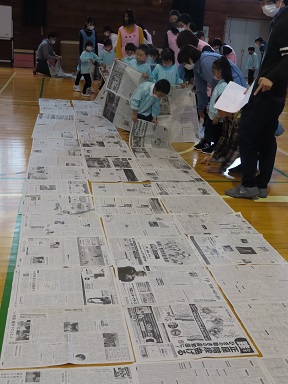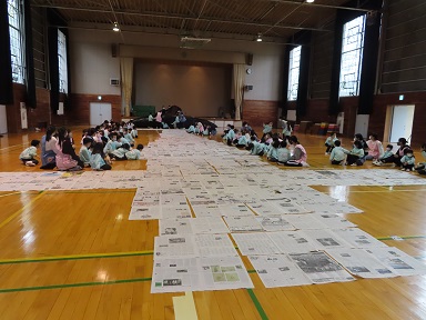 新聞紙を設計図通りに床に皆で並べて、本物のクジラの大きさに!