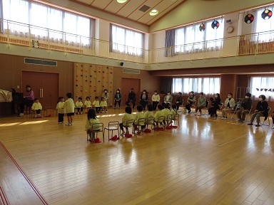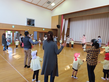 年少さんでは、参観にきてくださったお父さんやお母さんと、『ひっつきもっつき』を楽しんでいました。