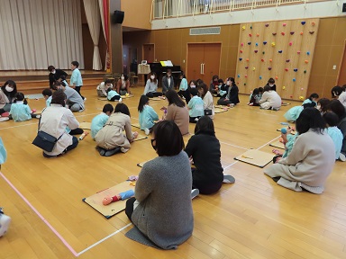 例年は、11月は年長・年中・年少の土曜参観を行いますが、今年はまだコロナ禍のため、6月の参観と同様に広い遊戯室を使って、1日1クラスの参観を行いました。毎年土曜参観の日に行っているPTA講演会は、残念ながら中止しました。