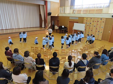 参観では、日頃のお集まりの様子を見ていただいたり、皆で歌っている季節の歌を聞いていただいたり、クラスのお友だちと一緒に遊ぶ様子を見ていただいたりしました。
