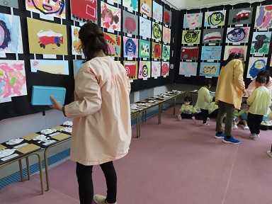 作品展の準備の様子。年長さんたちは大がかりで素敵な立体製作が完成しています。お楽しみに!