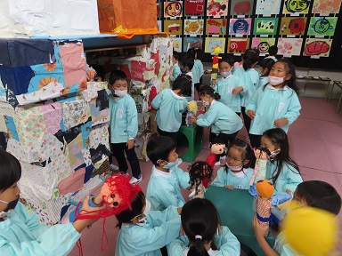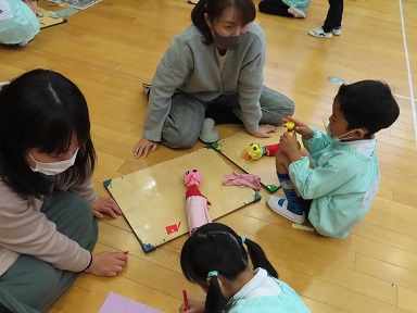 年長さんのクラスでは、作品展に飾る予定の人形を作るお手伝いをしていただいたりしました。