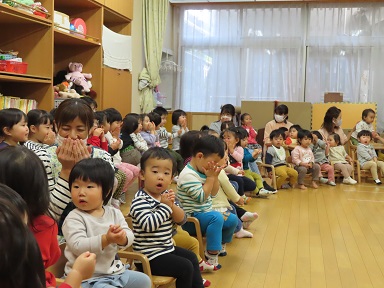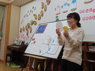 先生が『食いしん坊のおばけのこ』の歌を歌いながらパネルシアターを見せてくれました。シルエットでバナナやレモンやりんごをよく当てられましたね!