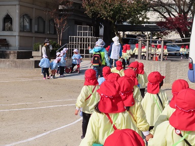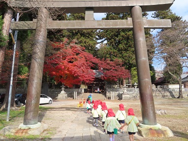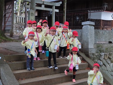 今日、年少さんは年中さんたちにお見送りしてもらい、1㎞強の道のりを歩いて大宮神社に行ってきました。