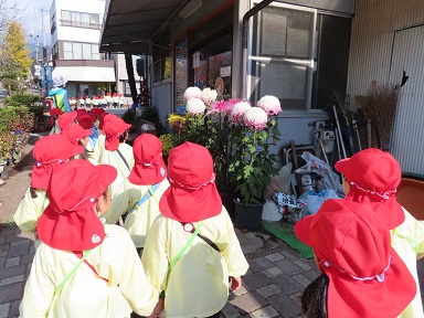 道沿いには、大小様々な色の菊が咲き、南天の実やヤツデの花も見頃で、”秋”を探しながら楽しく歩いて行きました。
