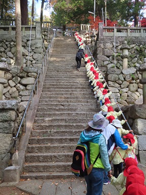 大宮神社には、短大の階段程長い階段があります。みんなゆっくり落ち着いて上まで登り切りました。