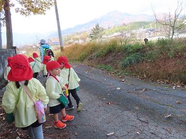 神社の境内や周辺には、クヌギやナラのどんぐりが落ちていて、歓声を上げながら拾い集めていましたよ!楽しい秋のお散歩ができました。