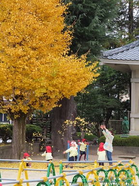 暖かい日が続いていますが、もう晩秋。園庭の銀杏も散り始めました。