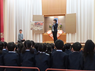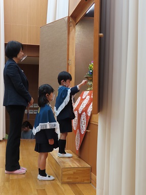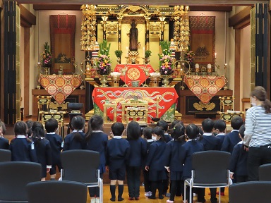 園の報恩講では、子どもたちが親鸞聖人の御一生を知り、「命の大切さを感じ、自分の周囲の様々な方々、また、目に見えないところでお世話になっている方々への感謝を感じる」ことを大切にしています。
