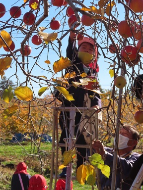 今村さんが、りんごのもぎ方を教えてくださり、早速畑に入って収穫。