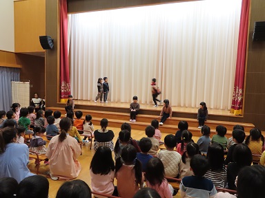 金曜日の劇とリズムの会の当日は、未満児さんたちは参加しませんでしたので、今日、年長さんの劇を見せてもらいました。