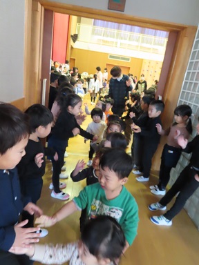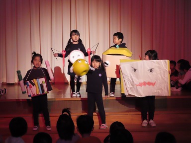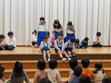 会も終わり、お部屋では役を入れ替えて劇遊びの続きが始まっているようです。年中さんの保育室からも、年長さんの劇の挿入歌が聞こえてきています。