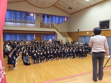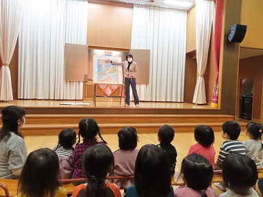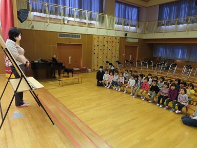 2歳児のお友だちのみの集会では、園長先生が掛け図を使ってお釈迦様のお話を分かりやすく教えてくださいました。
