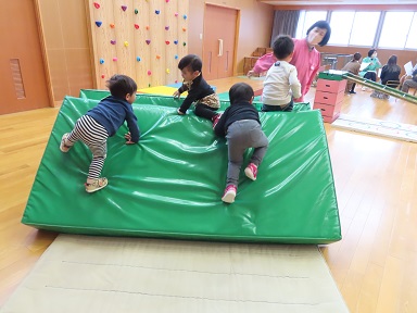 まだまだ大好きなお母さんから離れたくないお友だちもいましたが、育児講話の前後は皆と同じフロアで、お母さんと一緒に好きな遊びを楽しむことができました。