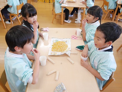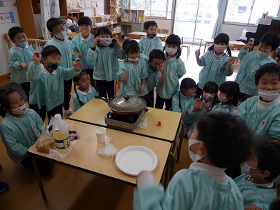 ・・・さくらんぼさんが遊んでいると・・・年長さんの廊下から香ばしいいい匂いがしてきました。