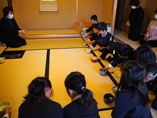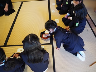 今年一年、いろいろな行事が中止になる中、元園長のお茶のお招きを受け、何度か”茶道”を体験してきた年長さんたち。作法を知り、体の動きも少しずつ変わってきました。