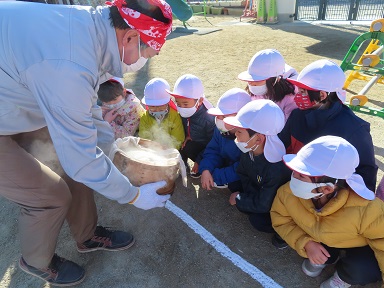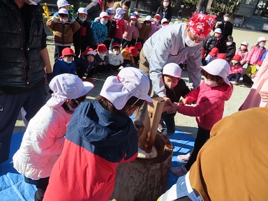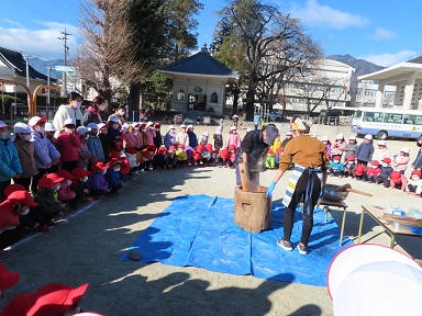 今日はお餅つきがありました。ボールに入れた水がすぐ凍ってしまうような寒さの中でしたが、大きな声で「そーれ、よいしょ!」と掛け声をかけながらお餅つきの応援をしました。