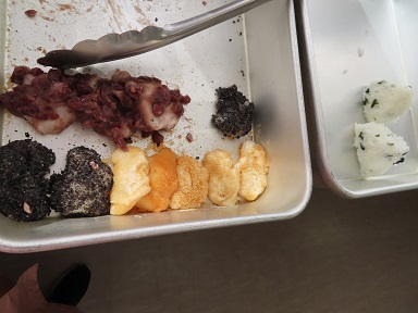 2歳児はおにぎりと小さな3色餅、0,1歳児はおにぎりときな粉のおはぎをいただきました。