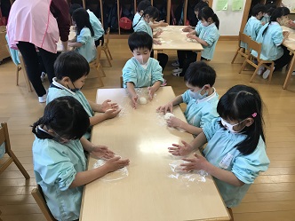 できたお餅で年長さんは1人1つ鏡餅を、年中さん年少さんはクラスで1つ鏡餅をつくり早速飾りました。年長さんはお餅が手にくっついてちょっと苦労したお友だちもいましたが、2つ目のお餅を丸める頃には手つきよく形を整えられました。