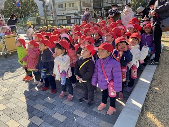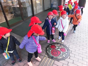 先週のお話になってしまいますが、年少さんが丘の上のお散歩に出かけ、年末の町の様子を見てきました。手始めは園の近くのハミングパルから。