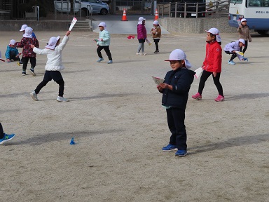 年長さんは羽子板をつくって、お友だちと羽根つきをして遊んでいました。