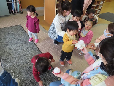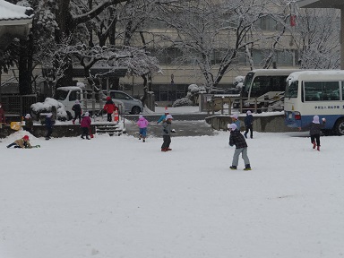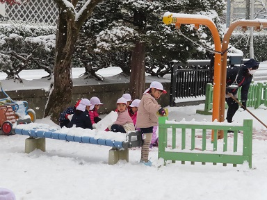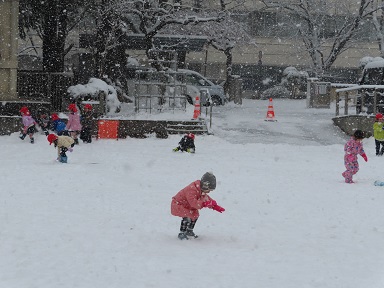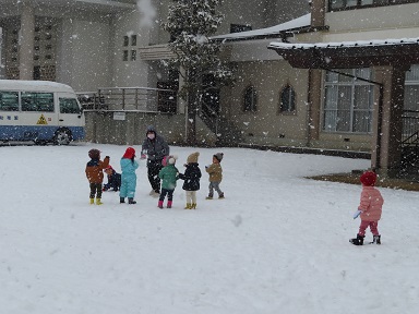 去年は雪の”ゆ”の字もない程降らなかったので、雪遊びの楽しさを知らずに過ごした子どもたちでしたが、今冬は、氷もできるし雪も積もって、冬ならではの遊びがしっかりできます。早速今日は、雪合戦や雪山を作って滑り台を楽しむ等、寒さに負けずに銀世界の中で遊ぶ子どもたちでした。