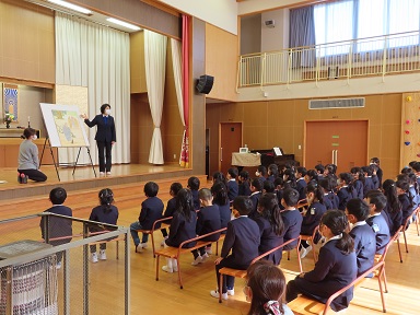様子を画像に残そうと思い、集会の途中で静かに会場の遊戯室に入りました。静かに入ろうとはしましたが、どうしても戸を開閉する音はします。でも、皆が誰か来たことに気づいている筈なのですが、誰もこちらを向かず、絵図や園長先生から目を離すことなく園長先生のお話を聞いていました。素晴らしい成長の姿です。こんな姿を見せてくれる年長さんを、胸を張ってそれぞれの小学校へ送り出したいと思います!