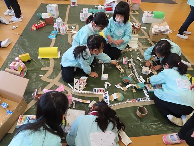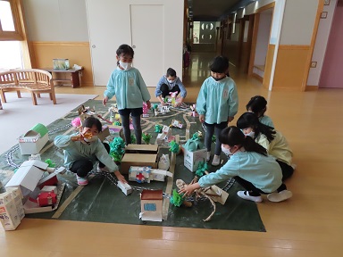 もみじさんは、「自分たちの町を作りたい!」と牛乳パックや空き箱を切って組み合わせて建物などをつくって、ジオラマのような緻密な町を作りあげています。博物館を作り、実際に飾ってある大きな恐竜の骨までこだわって作る等、友達と相談しながら、または手伝ってもらいながら、素敵な町ができあがりつつあります。