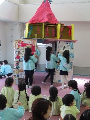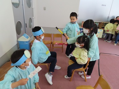 きく組さんも「自分たちの町を作りたい!」と、年長みんなで作ったハミングパルの時計台を本物さながらにしようと、操り人形を作ったり、町にある食べ物屋さん、お医者さん、バス、花屋さんなどのお店を作り、広いプール室を使ってお客さんを呼んで等身大の町を作りあげています。