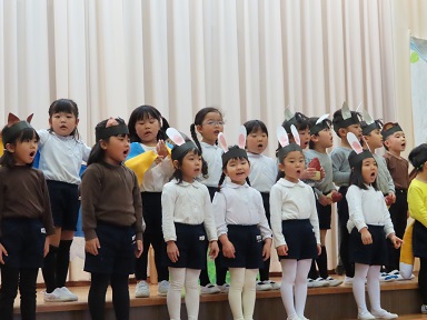 最後には、年長さんが「年中さん、楽しい劇をありがとう。年少さん、素敵な歌をありがとう。」とお礼に歌のプレゼントをしてくれました。