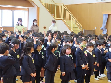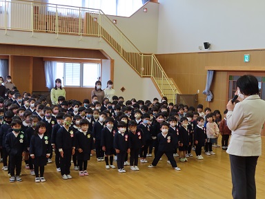 今日で令和2年度の3学期が終了となりました。年長・年中・年少・2歳児のお友達が遊戯室に集まり、終業式を行いました。
