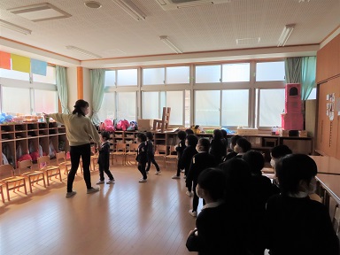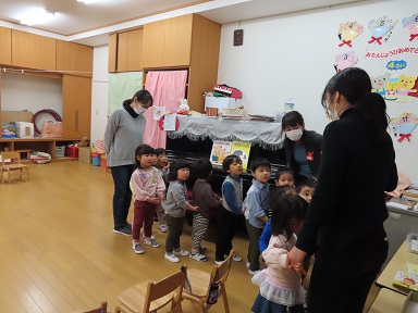 2歳児のお友達は以上児の集会に参加するのは初めてでしたが、年少さんの隣で、年少さんの真似をして園長先生のお話を静かに聞いていました。今日は、来年度のクラス発表もあり、新しい名札を着けて集まった子ども達。園長先生に新しいクラスの名前を呼ばれると、元気に手を挙げていました。