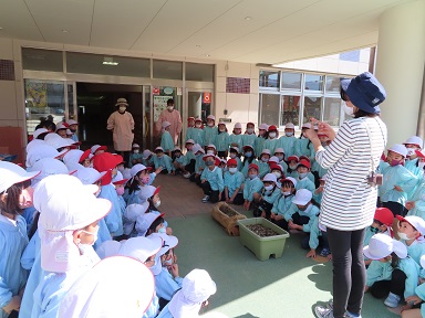 年中さんに”子どもの森プロジェクト”の一環で4年間年長児が育てている”どんぐりの木”を託したり、